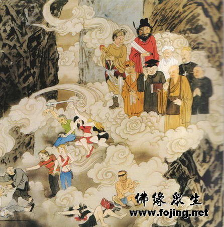 《華嚴經》云:“一切法唯心所現,唯識所變”。森羅萬象,無一不從吾人心性變現,是故宇宙有無限維次空間,各維次空間亦有芸芸衆生,無限維次空間,即佛家雲“法界”一念純淨純善,高登極樂維次空間,一念嗔恚嫉妒,堕如地獄修羅法界,現代科學家透過極繁複的試驗,逐漸發現事實真相,而釋加牟尼佛于三千年前,早已将此自然法則,講述訴明白,後人記錄會集而成《大藏經》。近代畫家江逸子居士禀承師訓,苦心繪制“地獄變相圖”,巨幅長達五十米,勸導世人明因識果,去惡修善,獲得廣大回響,今乃編輯精美畫冊,詳明其要,便于讀閱,及欲引人時時警策,念念提攜,力挽狂瀾于亂世洪流,其深悲宏智,誠屬難能可貴.________ 釋淨空 2005年3月24日