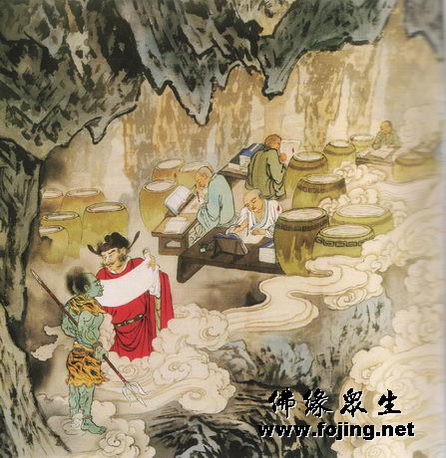 迷朦光中,幾個青面差使,押解一批罪犯,在寒鐵山洞穴中穿梭而過,這批罪犯,個個衣冠楚楚,看得出其生前之顯赫與榮耀,,從服飾穿著來看,有不同的階級與地位,有的應該是政客,有的應該是掌有權位的學者,在他們的神色之間,依然殘留幾分得意與跋扈,摻雜人群中也有宗教人士,神職道侶,盡享人間一切福報,辜負衆生之供養,此時個個神情凝重,似乎已嗅到“大事不妙的氣息。”