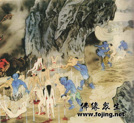 又有罪人習嗜殺生,手段狠毒殘酷,或以弓箭槍彈,或刀叉戟矛,或射,或殺、或刺、或剁,或以核子生化武器,毒殺衆生,或以圈網捕殺禽獸,以販賣或啖食,以上種種罪人常受此戟腹抛空地獄罪報。時有千百夜叉厲鬼,口牙如劍眼似電光,其狀兇惡,手執鋼戟,或刺透耳目,或穿口鼻,或截穿腹背,或抛向空中翻滾在以鋼戟刺接,或丢置火床煎爆,或喂鐵汁,業報無有終時,永不超升,是謂無間地獄。