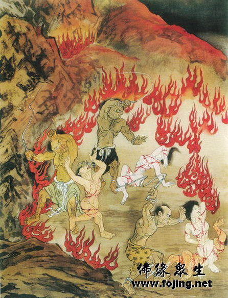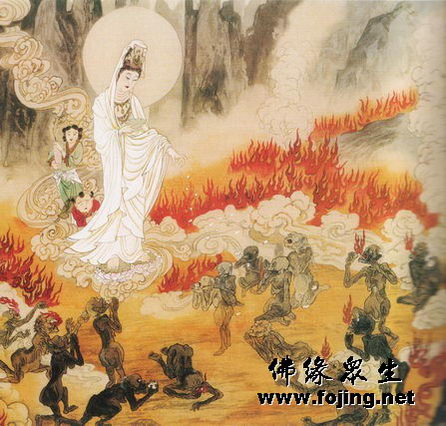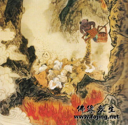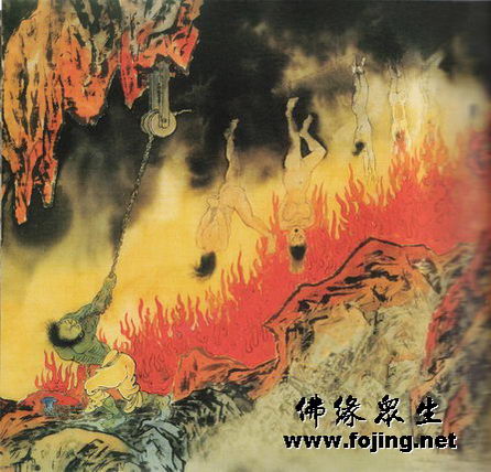 前有寒冰獄,此有火煉處,此處鐵山萬仞,四周環繞,周圍數千裏,一片火海,不毛之地,稱之爲“餓鬼地獄”。堕此地獄罪魂,生前盡是悭貪吝啬之人,雖用萬貫之産,依然滴水不舍,如今堕此地獄,落得骨瘦如柴,雙目如鈴,肚皮空大猶如洩氣皮袋,這些罪魂,因貪而饑,因悭無福,嗔怒哀号而噴烈火,其狀可怖,又稱“焰口地獄“,即使大悲觀世音或地藏王菩薩,前來施食拯救,多因貪嗔無福,張口欲食,烈火已将食物燒燼,呼天搶地,又能奈何呢?其中亦有極微數罪魂,或在過去生中,偶随人誦讀經典,或稱念佛号,此時感念菩薩施舍,心起刹那善根,合掌稱念經句或佛号,頓時嗔火熄消,可享施食。若心起歡喜,持續稱念不綴,随即可以超生,嗚呼!一旦堕入焰口獄,浩瀚嗔海烈火身,能起一絲清淨心,談何容易,微乎其微啊!