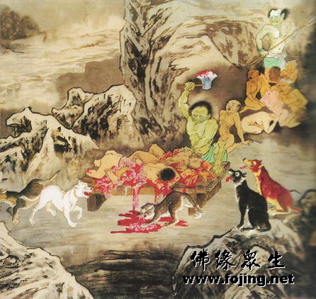 堕此地獄,隻有刀叉伺候,狼群環視,受報之人拖拉上砧石,活殺生剁,斬首截肢,屍塊橫飛,血肉模糊,衆生争食心肝腸肺,看他們争食一幕,也不過是我們生前嗜口欲之寫照,經云:“心業畫師,自業畫作:。如是因、如是果、怨誰呢?厲鬼現出你生前殘酷摸樣,手持厲斧支解你的身體,四周狼群環伺,垂誕等待,不正是你自己招感來的?