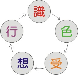 以上圖來說,其順序為:識 → 色 → 受 → 想 → 行 → 識。心識裡面的概念(唯識家稱之為種子)是怎麼來的呢?當意識生起,則主導色身而產生言行;當色身與外境接觸,則有各種感受,苦受與瞋相應,樂受與貪相應,不苦不樂受與癡相應;感受生起就有種種的想法,稱之為「妄想」,而產生不同程度的執取,稱之為「執著」;將這樣的經驗或認知輸入意識裡面,產生新的概念。若是以前沒有的,則增加一個新的概念,若是本來就有的,則會增強此概念。一直這樣,周而復始。