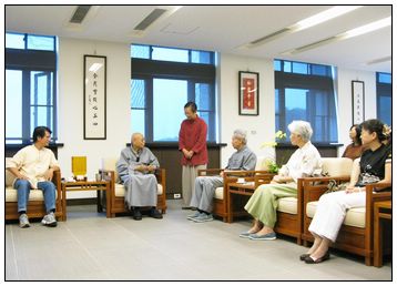 拿出一份預擬的題綱,台北教育大學「生命教育與健康促進研究所」新科碩士林泰石菩薩,把握難得的機會向聖嚴師父請益。他的發問直率坦然,讓陪同前來的玄奘大學講座教授羅宗濤與夫人陳靜雅女士,台北教育大學生命教育所所長陳錫琦與陳淑香伉儷、語創系涂艷秋教授,以及政治大學丁敏副教授及夫婿俞雨霖先生,一邊覺得莞爾,卻也幾許期待──聽聽師父怎麼說。
